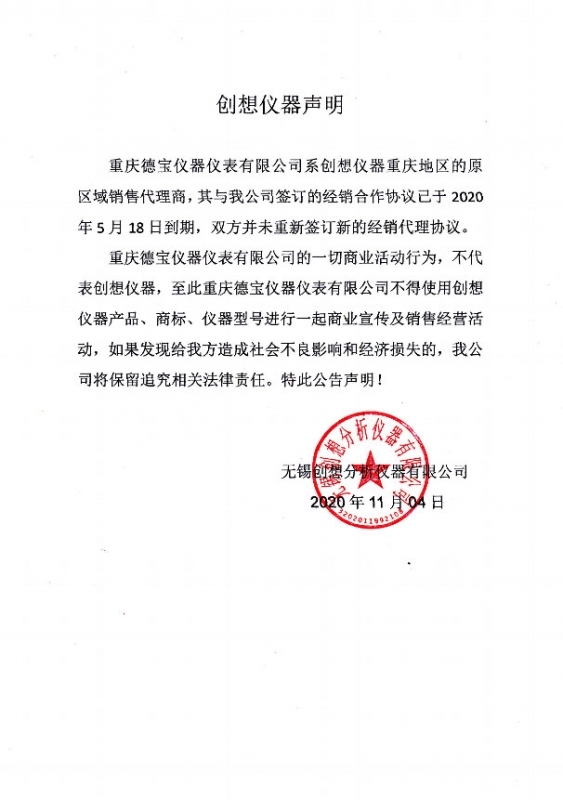 創(chuàng)想儀器聲明與重慶經(jīng)銷商代理協(xié)議已到期