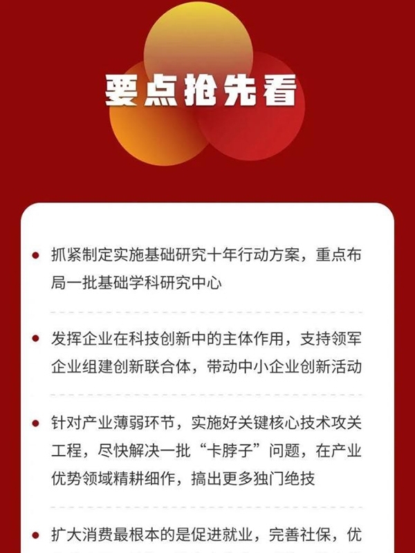 一是強(qiáng)化國(guó)家戰(zhàn)略科技力量。要充分發(fā)揮國(guó)家作為重大科技創(chuàng)新組織者的作用,堅(jiān)持戰(zhàn)略性需求導(dǎo)向,確定科技創(chuàng)新方向和重點(diǎn),著力解決制約國(guó)家發(fā)展和安全的重大難題。要發(fā)揮新型舉國(guó)體制優(yōu)勢(shì),發(fā)揮好重要院所高校國(guó)家隊(duì)作用,推動(dòng)科研力量?jī)?yōu)化配置和資源共享。要抓緊制定實(shí)施基礎(chǔ)研究十年行動(dòng)方案,重點(diǎn)布局一批基礎(chǔ)學(xué)科研究中心,支持有條件的地方建設(shè)國(guó)際和區(qū)域科技創(chuàng)新中心。要發(fā)揮企業(yè)在科技創(chuàng)新中的主體作用,支持領(lǐng)軍企業(yè)組建創(chuàng)新聯(lián)合體,帶動(dòng)中小企業(yè)創(chuàng)新活動(dòng)。要加強(qiáng)國(guó)際科技交流合作。要加快國(guó)內(nèi)人才培養(yǎng),使更多青年優(yōu)秀人才脫穎而出。要完善激勵(lì)機(jī)制和科技評(píng)價(jià)機(jī)制,落實(shí)好攻關(guān)任務(wù)“揭榜掛帥”等機(jī)制。要規(guī)范科技倫理,樹立良好學(xué)風(fēng)和作風(fēng),引導(dǎo)科研人員專心致志、扎實(shí)進(jìn)取。