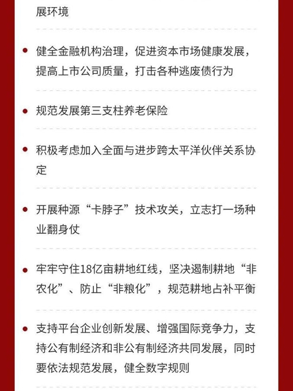 四是全面推進(jìn)改革開放。構(gòu)建新發(fā)展格局,必須構(gòu)建高水平社會(huì)主義市場(chǎng)經(jīng)濟(jì)體制,實(shí)行高水平對(duì)外開放,推動(dòng)改革和開放相互促進(jìn)。要完善宏觀經(jīng)濟(jì)治理,加強(qiáng)國(guó)際宏觀政策協(xié)調(diào)。要深入實(shí)施國(guó)企改革三年行動(dòng),優(yōu)化民營(yíng)經(jīng)濟(jì)發(fā)展環(huán)境,健全現(xiàn)代企業(yè)制度,完善公司治理,激發(fā)各類市場(chǎng)主體活力。要放寬市場(chǎng)準(zhǔn)入,促進(jìn)公平競(jìng)爭(zhēng),保護(hù)知識(shí)產(chǎn)權(quán),建設(shè)統(tǒng)一大市場(chǎng),營(yíng)造市場(chǎng)化、法治化、國(guó)際化營(yíng)商環(huán)境。要健全金融機(jī)構(gòu)治理,促進(jìn)資本市場(chǎng)健康發(fā)展,提高上市公司質(zhì)量,打擊各種逃廢債行為。要規(guī)范發(fā)展第三支柱養(yǎng)老保險(xiǎn)。要積極考慮加入全面與進(jìn)步跨太平洋伙伴關(guān)系協(xié)定。要大力提升國(guó)內(nèi)監(jiān)管能力和水平,完善安全審查機(jī)制,重視運(yùn)用國(guó)際通行規(guī)則維護(hù)國(guó)家安全。
