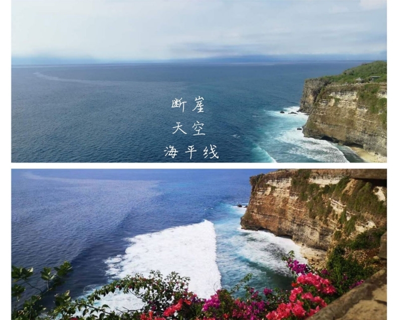 烏魯瓦圖斷崖位于巴厘島的最南端,是我們此行的最后一站,沿途的猴子據(jù)說會搶游客的帽子和眼鏡,讓我們一路有些忐忑,生怕遭遇這些“劫匪”。當我們終于站在斷崖的最高處,遠處海平線和天相接,海色融于天空,在別處很難看到如此開闊的海平線,頗為壯觀。而斷崖下水石相搏,浪花翻涌,又別是一番景致。大家紛紛駐足拍照,而見到金發(fā)美女就求合影的馬工更是沒有放過這個絕好的機會,和三位美女留影合照,熾烈的陽光下,馬工漆黑的膚色優(yōu)勢仿佛也沒成功搶鏡。