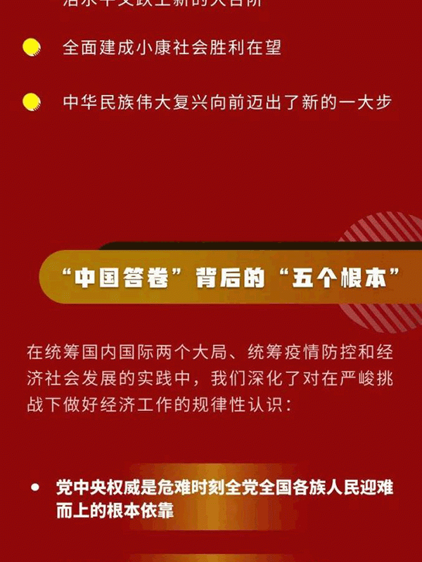 會(huì)議認(rèn)為,今年是新中國(guó)歷史上極不平凡的一年。面對(duì)嚴(yán)峻復(fù)雜的國(guó)際形勢(shì)、艱巨繁重的國(guó)內(nèi)改革發(fā)展穩(wěn)定任務(wù)特別是新冠肺炎疫情的嚴(yán)重沖擊,我們保持戰(zhàn)略定力,準(zhǔn)確判斷形勢(shì),精心謀劃部署,果斷采取行動(dòng),付出艱苦努力,交出了一份人民滿意、世界矚目、可以載入史冊(cè)的答卷。我國(guó)成為全球唯一實(shí)現(xiàn)經(jīng)濟(jì)正增長(zhǎng)的主要經(jīng)濟(jì)體,三大攻堅(jiān)戰(zhàn)取得決定性成就,科技創(chuàng)新取得重大進(jìn)展,改革開放實(shí)現(xiàn)重要突破,民生得到有力保障。這些成績(jī)來之不易,歷經(jīng)艱難險(xiǎn)阻,是以習(xí)近平同志為核心的黨中央堅(jiān)強(qiáng)領(lǐng)導(dǎo)的結(jié)果,是全黨全軍全國(guó)各族人民團(tuán)結(jié)奮戰(zhàn)的結(jié)果。