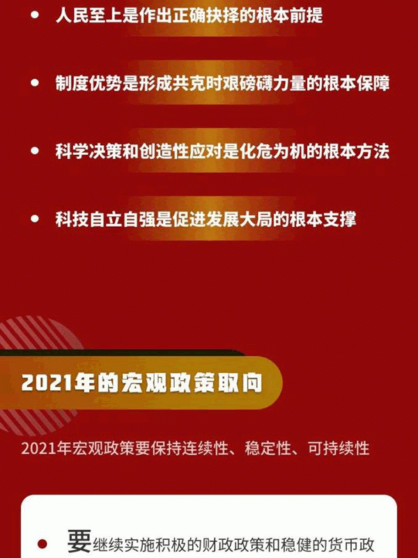 會(huì)議強(qiáng)調(diào),明年是我國(guó)現(xiàn)代化建設(shè)進(jìn)程中具有特殊重要性的一年。做好明年經(jīng)濟(jì)工作,要以習(xí)近平新時(shí)代中國(guó)特色社會(huì)主義思想為指導(dǎo),全面貫徹黨的十九大和十九屆二中、三中、四中、五中全會(huì)精神,堅(jiān)持穩(wěn)中求進(jìn)工作總基調(diào),立足新發(fā)展階段,貫徹新發(fā)展理念,構(gòu)建新發(fā)展格局,以推動(dòng)高質(zhì)量發(fā)展為主題,以深化供給側(cè)結(jié)構(gòu)性改革為主線,以改革創(chuàng)新為根本動(dòng)力,以滿足人民日益增長(zhǎng)的美好生活需要為根本目的,堅(jiān)持系統(tǒng)觀念,鞏固拓展疫情防控和經(jīng)濟(jì)社會(huì)發(fā)展成果,更好統(tǒng)籌發(fā)展和安全,扎實(shí)做好“六穩(wěn)”工作、全面落實(shí)“六?!比蝿?wù),科學(xué)精準(zhǔn)實(shí)施宏觀政策,努力保持經(jīng)濟(jì)運(yùn)行在合理區(qū)間,堅(jiān)持?jǐn)U大內(nèi)需戰(zhàn)略,強(qiáng)化科技戰(zhàn)略支撐,擴(kuò)大高水平對(duì)外開放,確?!笆奈濉遍_好局,以優(yōu)異成績(jī)慶祝建黨100周年。
