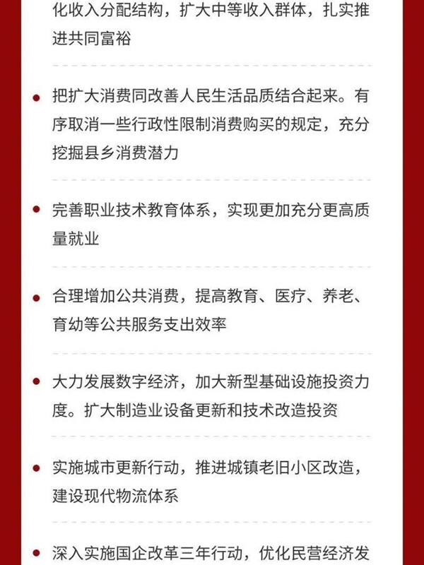 三是堅(jiān)持?jǐn)U大內(nèi)需這個(gè)戰(zhàn)略基點(diǎn)。形成強(qiáng)大國(guó)內(nèi)市場(chǎng)是構(gòu)建新發(fā)展格局的重要支撐,必須在合理引導(dǎo)消費(fèi)、儲(chǔ)蓄、投資等方面進(jìn)行有效制度安排。擴(kuò)大消費(fèi)最根本的是促進(jìn)就業(yè),完善社保,優(yōu)化收入分配結(jié)構(gòu),擴(kuò)大中等收入群體,扎實(shí)推進(jìn)共同富裕。要把擴(kuò)大消費(fèi)同改善人民生活品質(zhì)結(jié)合起來。有序取消一些行政性限制消費(fèi)購(gòu)買的規(guī)定,充分挖掘縣鄉(xiāng)消費(fèi)潛力。要完善職業(yè)技術(shù)教育體系,實(shí)現(xiàn)更加充分更高質(zhì)量就業(yè)。要合理增加公共消費(fèi),提高教育、醫(yī)療、養(yǎng)老、育幼等公共服務(wù)支出效率。要增強(qiáng)投資增長(zhǎng)后勁,繼續(xù)發(fā)揮關(guān)鍵作用。要發(fā)揮中央預(yù)算內(nèi)投資在外溢性強(qiáng)、社會(huì)效益高領(lǐng)域的引導(dǎo)和撬動(dòng)作用。激發(fā)全社會(huì)投資活力。要大力發(fā)展數(shù)字經(jīng)濟(jì),加大新型基礎(chǔ)設(shè)施投資力度。要擴(kuò)大制造業(yè)設(shè)備更新和技術(shù)改造投資。要實(shí)施城市更新行動(dòng),推進(jìn)城鎮(zhèn)老舊小區(qū)改造,建設(shè)現(xiàn)代物流體系。要加強(qiáng)統(tǒng)一規(guī)劃和宏觀指導(dǎo),統(tǒng)籌好產(chǎn)業(yè)布局,避免新興產(chǎn)業(yè)重復(fù)建設(shè)。