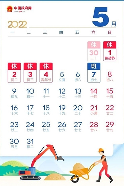 2022年4月30日-5月4日放假調休,共5天。5月7日(星期六)我們正常上班。節(jié)前各位同事安排好工作,配合行政做好清潔打掃工作,檢查好電源開關,關好門窗。節(jié)日期間,請大家注意人身安全和財產安全,愉快的度過假期。