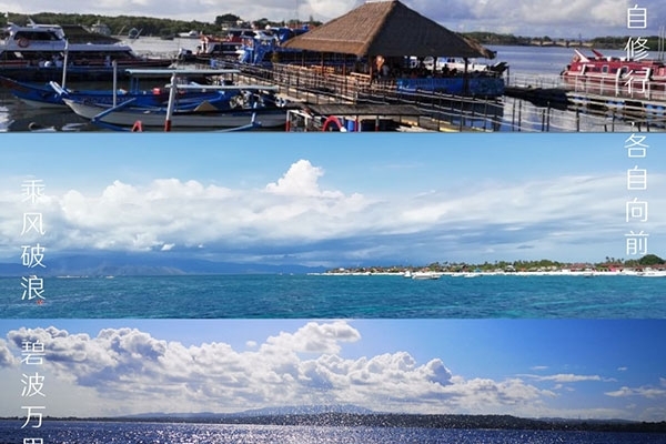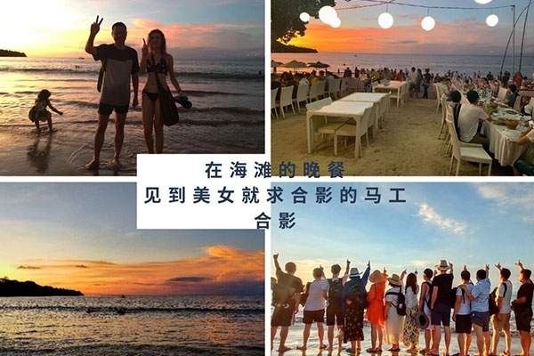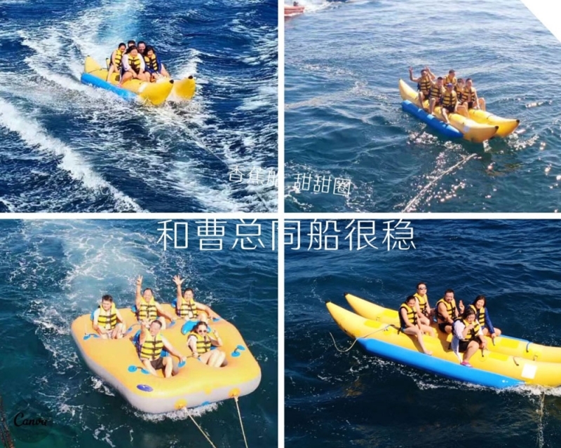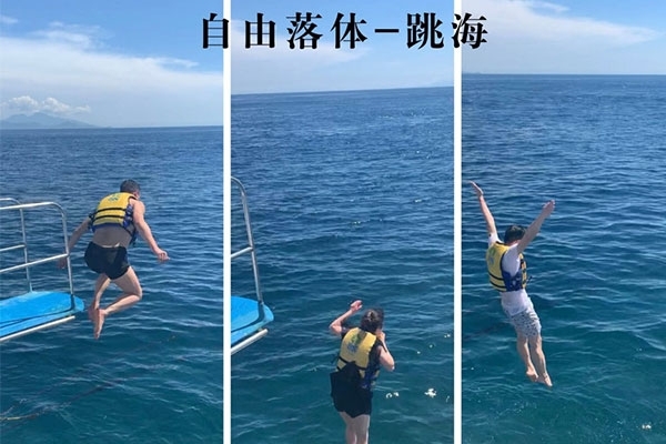 半小時后,我們首先到達了海中間由兩艘游輪搭建的漂浮“海上游玩基地”,除了“香蕉船”“甜甜圈”和“浮潛”這些項目,最有意思的是“跳海”,作為非專業(yè)隊員,大家入水姿勢各異,激起巨大的浪花。遺憾的是,“女神”曹總并沒有參與“跳?!?,估計她是為大家著想,怕入水海平面升高2米,淹沒“基地”,多年以后,我還是要感謝曹總的“不淹之恩”,讓我依然可以坐在在夕陽下回憶往昔。