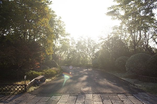 小鎮(zhèn)還未蘇醒,我們?nèi)ビ舆@份晨光,清晨的太陽冉冉升起,蔚藍(lán)色的天空分外惹眼,這份色彩是我們平日難以見到的光景。太陽是那么耀眼,你沒辦法與他對視,透過指縫,穿過林間,照耀在大地,石階小板抹上了斑駁的金色,所以你才知道,“嗯,太陽,他原來就在那里。”