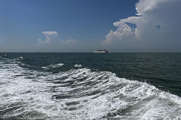 在清晨七點半的晨光中,滿載歡聲笑語的大巴,如同一艘陸地航船,載著我們駛向那片心心念念的蔚藍(lán)。一路上的談天說地,讓四個小時的車程變得輕快。當(dāng)咸腥的海風(fēng)透過車窗拂面而來,我們便知,目的地近了。沈家灣碼頭人頭攢動,我們的興奮之情也隨著海浪輕輕蕩漾。登上游輪,劈波斬浪,船艙內(nèi)是同事們不絕于耳的驚嘆與快門聲。那一刻,所有工作的疲憊仿佛都被海風(fēng)吹散,拋在了身后。